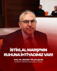 Saadet Partisi Hatay Milletvekili Necmettin Çalışkan, TBMM Genel Kurulu’nda İstiklal Marşı’nın kabul yıl dönümü dolayısıyla yaptığı konuşmada milli ruh ve bağımsızlık vurgusu yaptı.